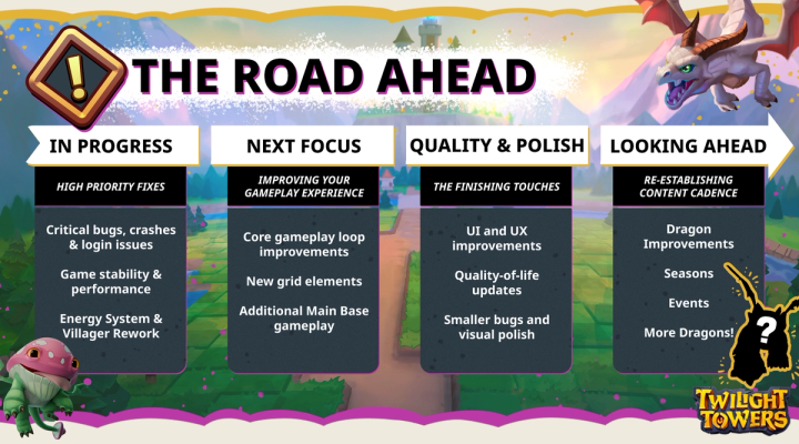 “What does this mean?” It means our team is focusing our resources on resolving all of the bugs that you reported to us while continuing to work on features that will improve the overall experience of Twilight Towers. But remember how we mentioned that we are a small team? Well, in order to prioritize bug fixing and feature implementation, we have to pause Seasons and Events until we can achieve an almost-perfect (because nobody’s 100% perfect) main base experience.